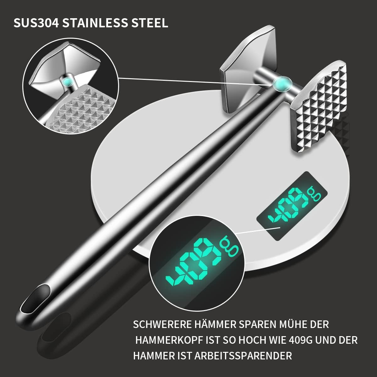 - 【Neues Design】–The New Meat Tenderiser Made of Stainless Steel,Massiver Fleischklopfer mit einem Gesamtgewicht von 409g, Das neue Design ist arbeitssparender.