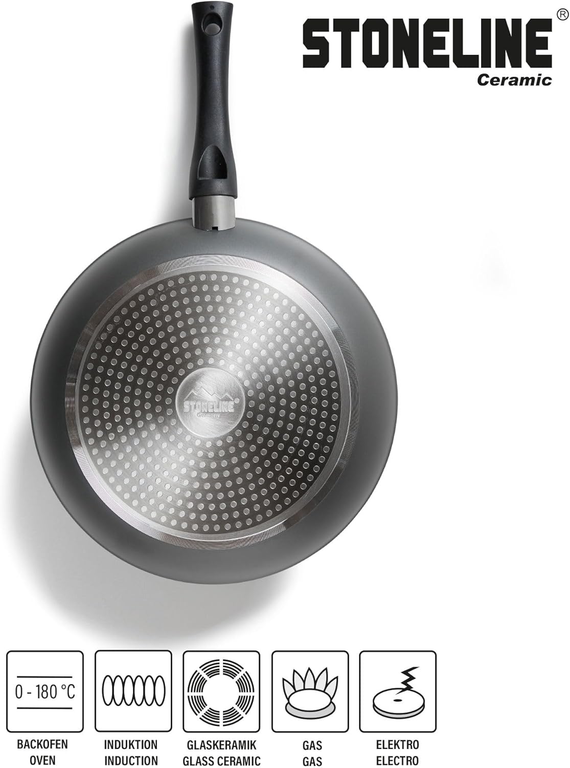 PFAS free ceramic coating: the ceramic frying pans are coated with the PFAS free and scratch-resistant STONELINE ceramic non-stick coating with real stone particles. Thanks to the extremely hard, durable ceramic coating with beading effect, the all-round pans will enjoy preparing food for a long time. The ceramic coating is suitable for flambéing up to 450°C.